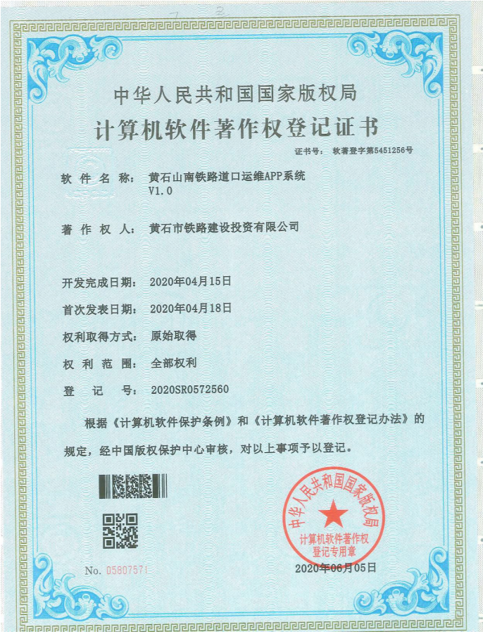 黃石山南鐵路道口無(wú)人值守技術(shù)共申請(qǐng)國(guó)家級(jí)8項(xiàng)專利技術(shù) ,其中《黃石山南鐵路道口智能化控制系統(tǒng)》、《黃石山南鐵路道口列車車載聯(lián)動(dòng)顯示系統(tǒng)》、《黃石山南鐵路道口調(diào)度中心綜合監(jiān)管系統(tǒng)》、《黃石山南鐵路道口運(yùn)維APP系統(tǒng)》4項(xiàng)成果已取得計(jì)算機(jī)軟件著作版權(quán)登記。