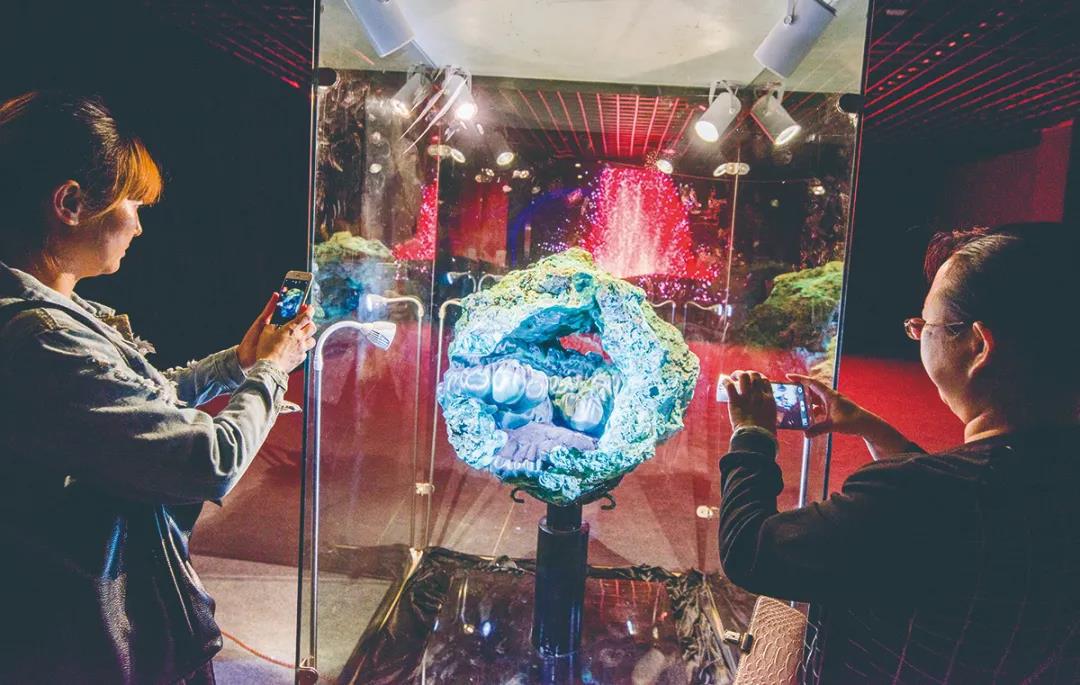 礦博園2號館是今年地科會設(shè)置的黃石文化創(chuàng)意體驗館。走進該館,工人們正在現(xiàn)場抓緊施工。