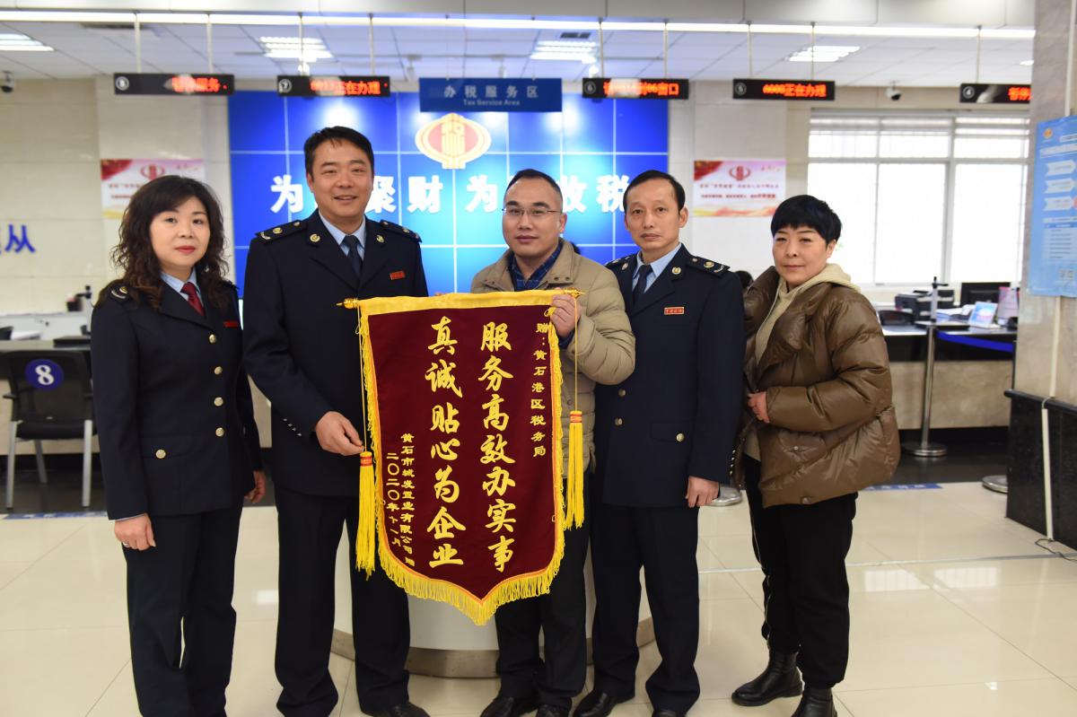 12月16日上午,城發(fā)置業(yè)(停車、教育)公司總經(jīng)理程勇向黃石港區(qū)稅務(wù)局送去一面錦旗,感謝黃石港區(qū)稅務(wù)局幫助公司享受增值稅期末留底稅額退稅優(yōu)惠政策,實(shí)現(xiàn)退稅590萬(wàn)元。