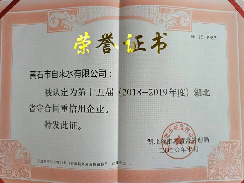為營(yíng)造誠(chéng)實(shí)守信的市場(chǎng)營(yíng)商環(huán)境,今年,省市場(chǎng)監(jiān)督管理局組織開(kāi)展了湖北省第十五屆(2018-2019年度)“守合同重信用”企業(yè)評(píng)選活動(dòng)。黃石市自來(lái)水有限公司憑借健全的企業(yè)信用管理體系、優(yōu)良的合同履約及信用狀況成功入選。